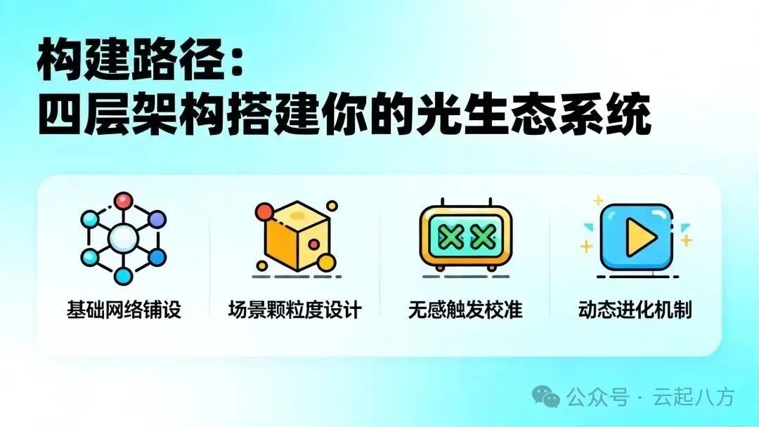 智慧照明通过场景化演绎,覆盖日常高频生活时刻,让灯光服务于生活细节: 1. 归家模式:开门瞬间自动触发玄关、客厅柔和灯光,驱散黑暗、营造归家暖意,同时联动窗帘、新风系统,同步打造舒适入户体验。 2. 观影模式:一键切换后,主灯缓缓关闭,背景氛围灯调至低亮度,联动电视、音响进入观影状态,沉浸式观影氛围感拉满。 3. 睡眠模式:卧室主灯熄灭,床头夜灯自动开启低亮度柔光,避免起夜强光刺眼;同时联动全屋灯光、安防设备,保障睡眠安全与舒适。 三、实操构建路径:四层架构搭建专属全屋光生态