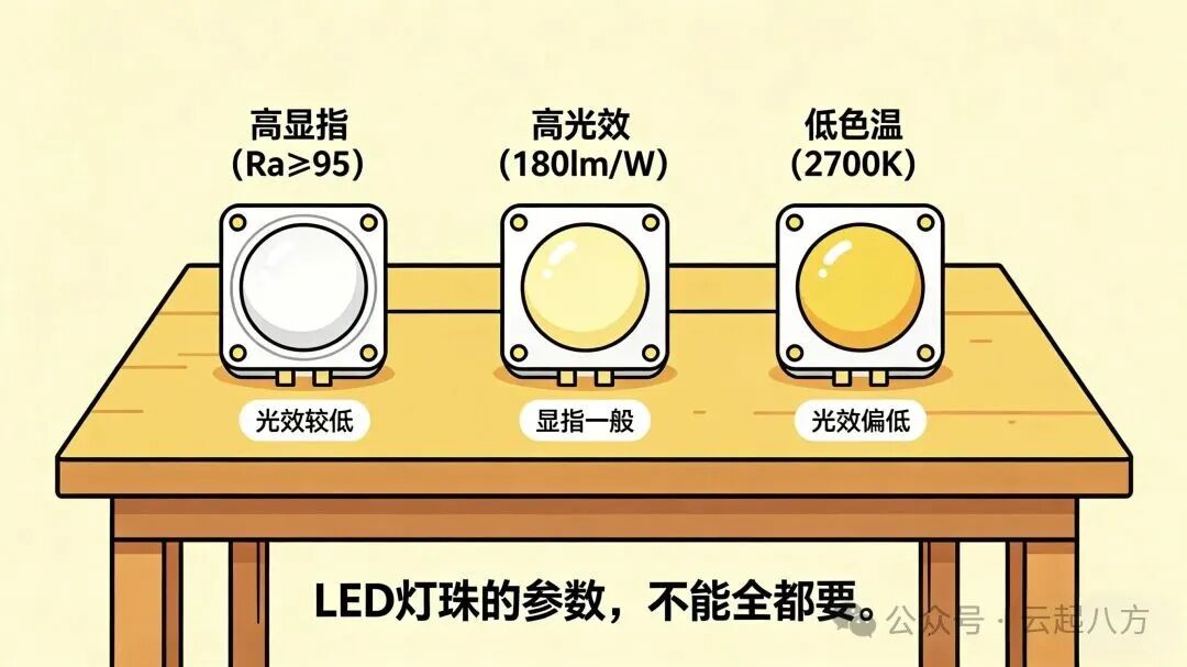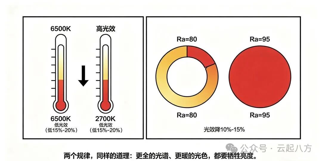 在同技术、同色温、同代产品下,Ra越高,光效通常越低,这是LED照明里普遍存在的技术取舍关系,但并非绝对的“必然定律”。 一、为什么普遍是“Ra越高,光效越低”