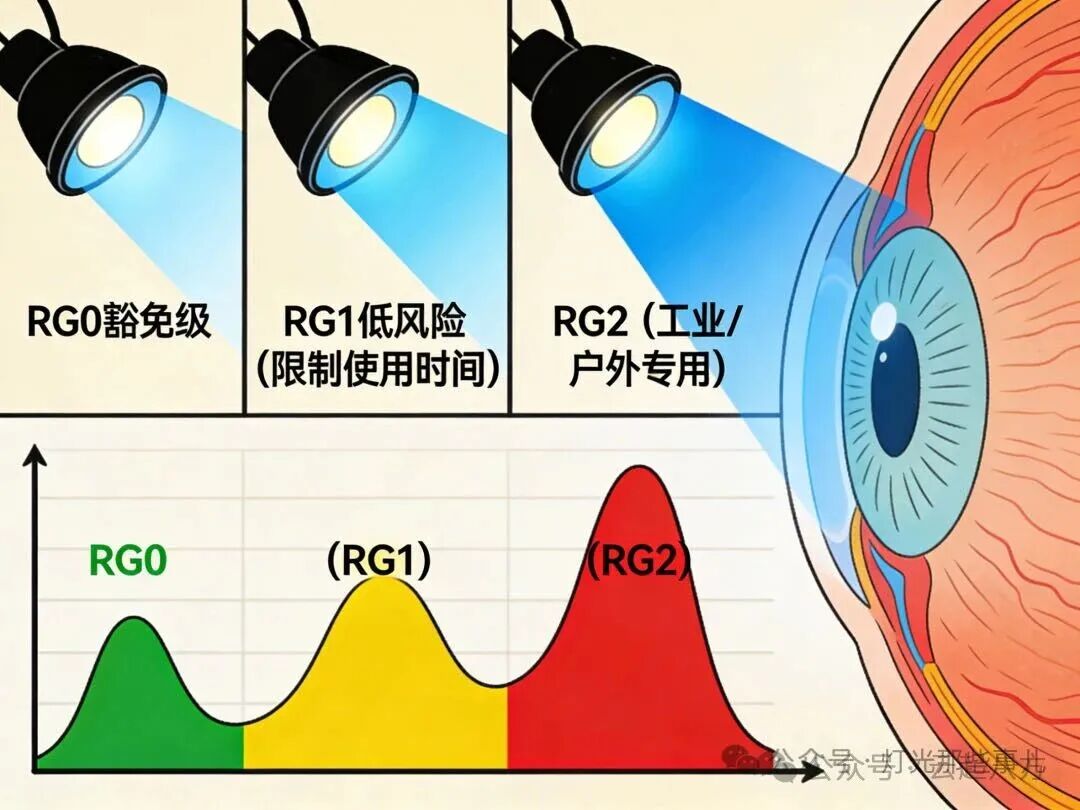二、蓝光危害等级:RG0才是安全线 根据GB/T 20145(IEC 62471) 光生物安全标准,蓝光危害被划分为多个等级,日常选购只需牢记两个关键等级: |
