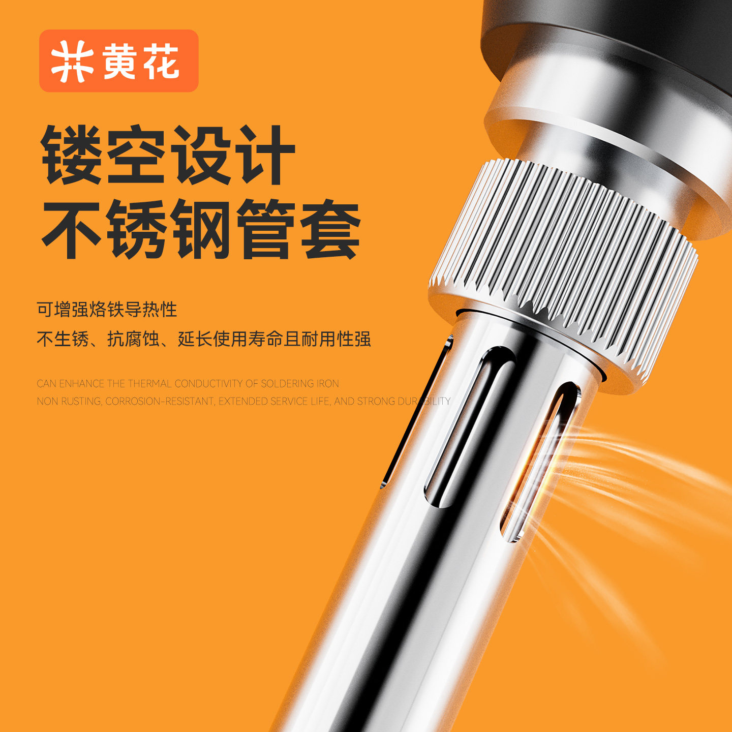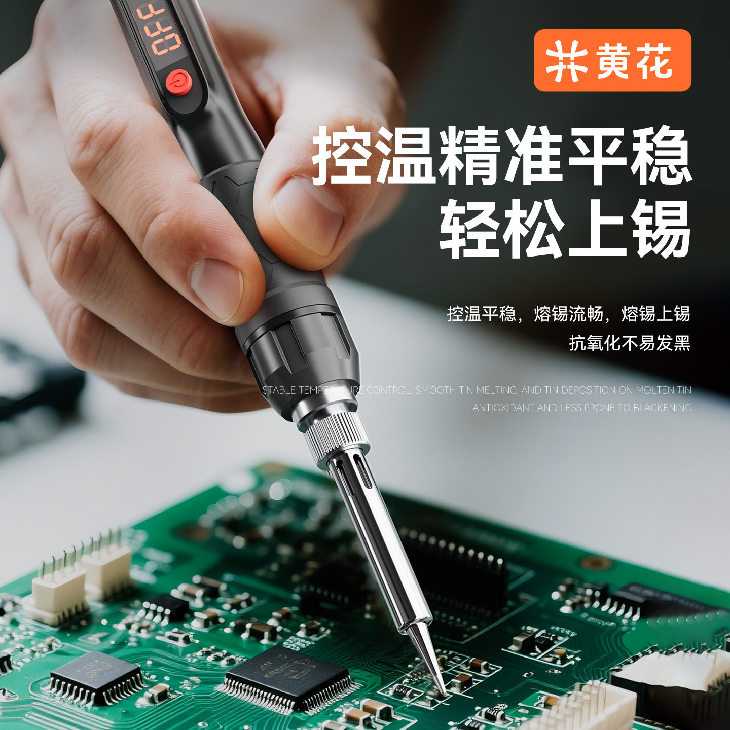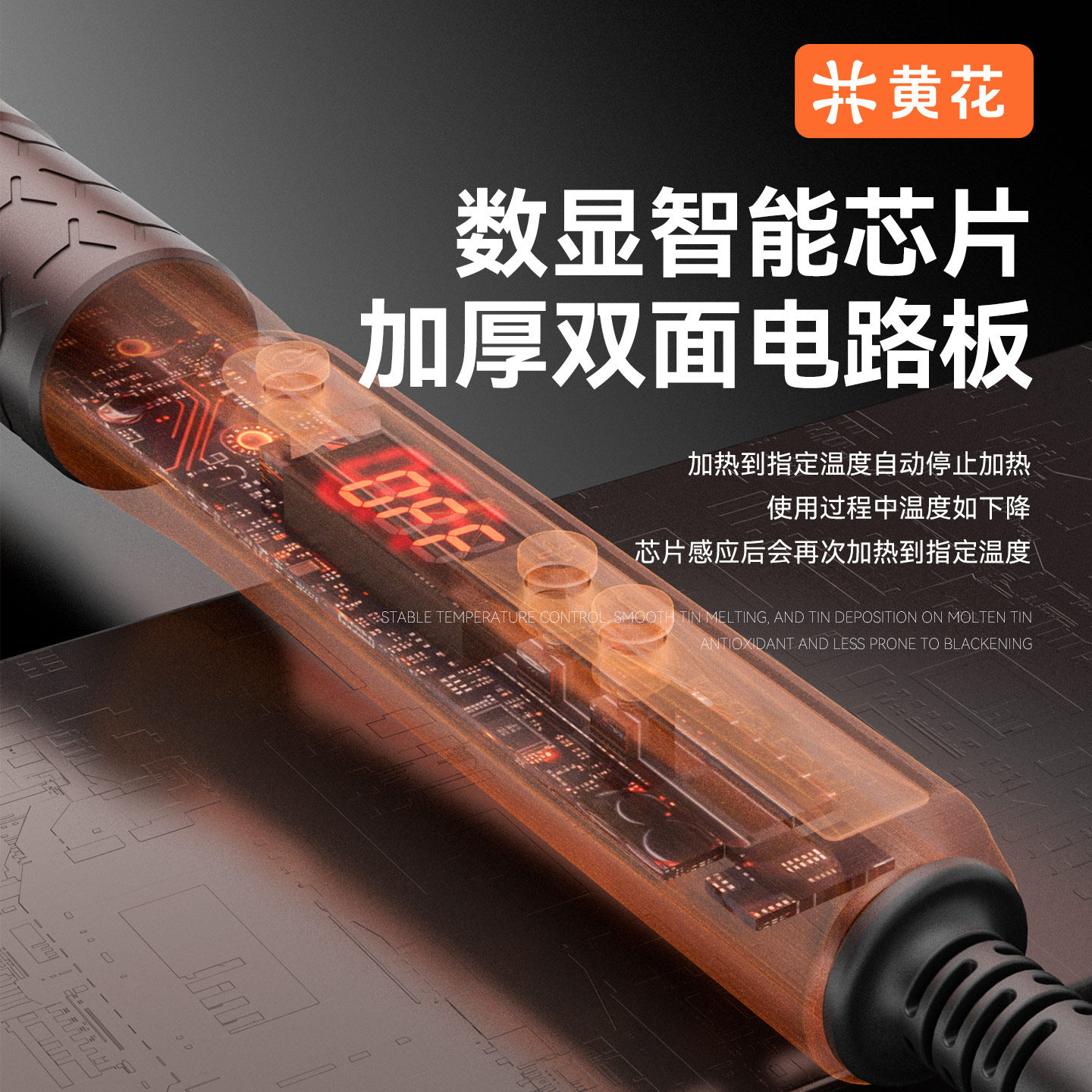 黄花数显电烙铁是一款专为家用维修设计的便携式焊接工具,集高效、精准与安全于一体。采用大功率加热元件,升温迅速,配合数显温控功能,可实时显示温度,精准调节至理想焊点温度,避免过热损坏元件。配备多种烙铁头,适用于电子元件、电路板、家电维修等多种场景。套装包含焊锡丝、吸锡器、支架等实用配件,满足日常焊接需求。人体工学设计手柄,握感舒适,长时间使用不易疲劳。小巧轻便,收纳方便,是家庭DIY、电子爱好者和专业维修人员的理想之选。安全耐高温材料,使用更安心。