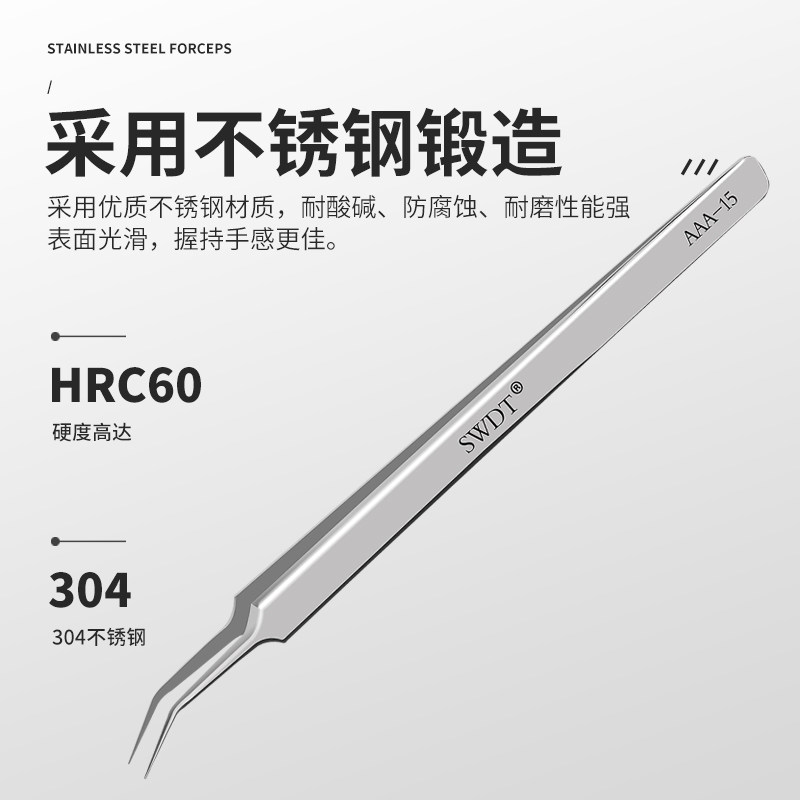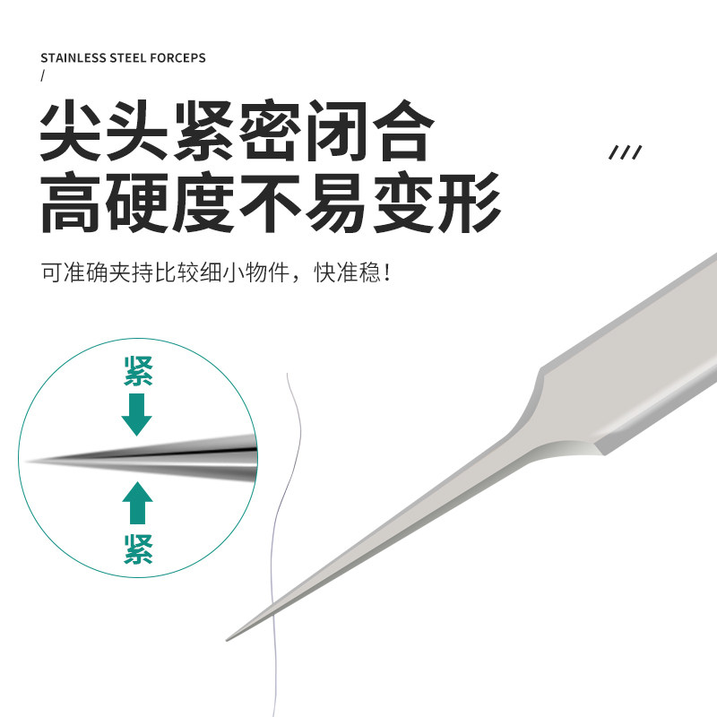 高精度不锈钢弯头特尖头镊子,专为电子维修、精密作业设计。采用优质不锈钢材质,具备优异的耐腐蚀性与持久耐用性,防静电处理确保操作安全。弯头特尖设计,可精准夹取微小元件,适用于手机、电脑、手表等精密设备的维修与组装。加长细咀结构,深入狭小空间,提升操作灵活性与稳定性。头部经过精细研磨,咬合紧密,不伤元件表面。人体工学手柄设计,长时间使用不易疲劳。是电子工程师、维修技师及DIY爱好者的理想工具,广泛应用于芯片拆卸、排线调整、微小零件装配等场景,精准高效,值得信赖。