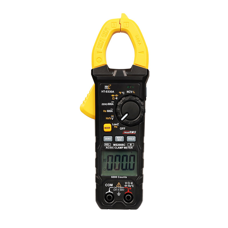 鑫思特HT-E500A/530A数字钳形万用表是一款高精度、多功能的电工测量工具,专为交直流电流检测设计。采用非接触式钳头设计,可安全便捷地测量高达1000A的交流或直流电流,无需断开电路。配备真有效值(True RMS)测量功能,确保在非线性负载下仍能获得精准读数。除电流外,还可测量电压、电阻、电容、频率、通断及二极管等参数,满足多种电工检测需求。大屏幕背光显示,数据清晰易读,支持数据保持与自动关机功能。结构坚固,符合CAT III安全等级,适用于工业维护、电力检修及家庭用电检测,是专业电工和工程技术人员的理想选择。