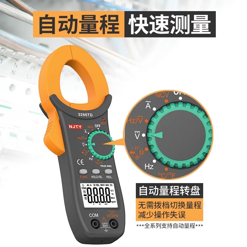 南京天宇3266TD是一款高精度多功能钳形万用表,集电流、电压、电阻、电容、频率、温度等多种测量功能于一体,适用于电力、制冷、暖通等行业。其独特的钳形设计无需断开电路即可非接触测量交流电流,操作安全便捷。配备背光LCD显示屏,数据读取清晰直观。支持温度测量(配K型热电偶),可精准检测制冷设备运行状态。具备数据保持、自动量程、低电压提示等实用功能,测量精度高、响应迅速。外壳采用高强度工程材料,具备良好的抗摔与绝缘性能,适合在复杂工业环境中使用。3266TD是电工、制冷维修人员理想的便携式检测工具。
