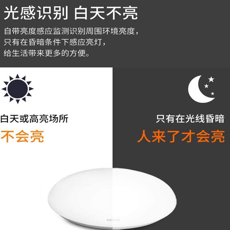 飞利浦LED楼梯楼道过道走廊阳台家用光控智能微波人体感应吸顶灯,集节能、智能与便捷于一体。采用高品质LED光源,光线柔和均匀,节能环保,寿命长久。内置光敏传感器与微波人体感应技术,白天自动关闭,夜晚或光线不足时,一旦检测到人体移动即自动亮灯,延时关闭,无需手动操作,特别适合楼梯、走廊、阳台等区域。微波感应灵敏度高,穿透力强,不受温度、灰尘影响,使用更稳定可靠。安装简便,吸顶设计美观大方,适配多种家居风格。智能守护,让夜间出行更安全、舒适,是现代家庭理想的照明解决方案。