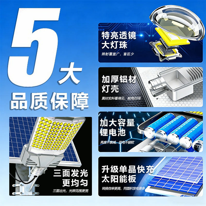 这款太阳能户外LED庭院灯专为农村及家庭庭院设计,采用高效单晶硅太阳能板,白天自动充电,夜晚智能亮灯,节能环保。配备大容量锂电池,续航持久,阴雨天也能稳定工作。高亮LED光源,照明范围广,亮度媲美传统路灯,有效提升夜间安全性。IP65级防水防尘设计,适应各种恶劣天气,耐用可靠。安装简便,无需布线,可壁挂或立柱安装,适用于庭院、花园、车道、门口等场所。大功率输出,光线均匀柔和,兼顾照明与美观,是现代农村家庭理想的绿色照明解决方案。