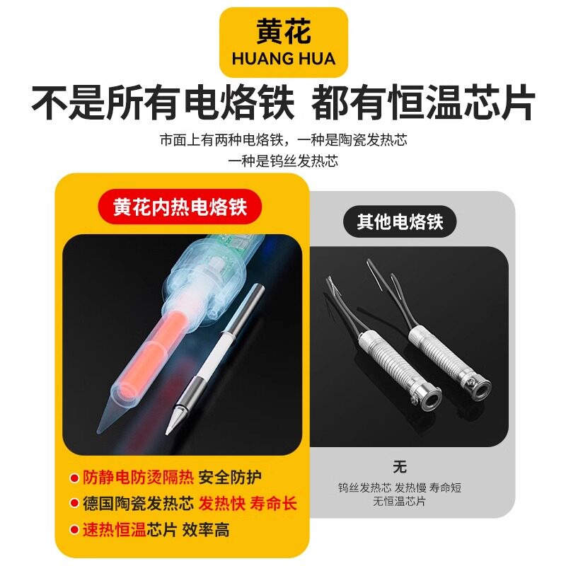 黄花电烙铁150W大功率数显内热式恒温焊锡枪,专为高效精准焊接设计。采用内热式发热芯,升温迅速、热效率高,150W大功率确保快速熔化焊锡,适用于多种焊接场景。配备高精度数显温控系统,温度可调范围广(通常200℃~480℃),实时显示当前温度,实现精准恒温控制,避免过热损坏元件。手柄人体工学设计,握感舒适,长时间使用不易疲劳。适用于电子维修、DIY制作、家电维护等家用及专业场合。安全可靠,具备防静电、过热保护功能,是家庭和电子爱好者的理想焊接工具。