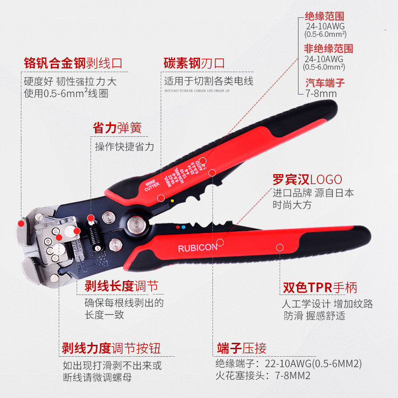 日本罗宾汉电工剥线钳是一款进口多功能全自动剥线神器,专为高效处理各类电缆设计。采用优质合金钢材质,刀刃锋利耐用,可精准剥除0.2–6.0mm²不同规格的电线绝缘层,不伤导体。全自动感应式设计,操作简便,单手即可完成剥线,大幅提升电工工作效率。钳身符合人体工学,握感舒适,防滑手柄确保安全操作。适用于家庭装修、工业布线、汽车维修等多种场景。兼具剥线、剪切、压接等多功能于一体,是专业电工和DIY爱好者的理想工具。凭借日本精工品质,这款剥线钳以高精度、高耐用性和卓越性能赢得广泛信赖,是现代电气作业中不可或缺的智能工具。