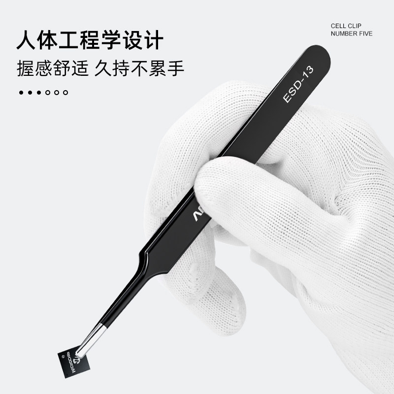 防静电镊子ESD-13是一款专为精密电子维修设计的工具,采用高品质不锈钢材质,具备优异的耐腐蚀性与耐用性。其扁圆头平口设计,夹持精准、力度适中,特别适合夹取芯片、电阻、电容等微小元件,广泛应用于电路板维修、半导体装配及实验室操作。表面经过特殊防静电处理,有效防止静电放电(ESD)对敏感电子元器件造成损伤,确保操作安全。手柄防滑设计,握感舒适,长时间使用不易疲劳。ESD-13兼具功能性、安全性与人体工学设计,是电子工程师、维修技术人员及DIY爱好者的理想选择,适用于手机、电脑、精密仪器等设备的精细作业。