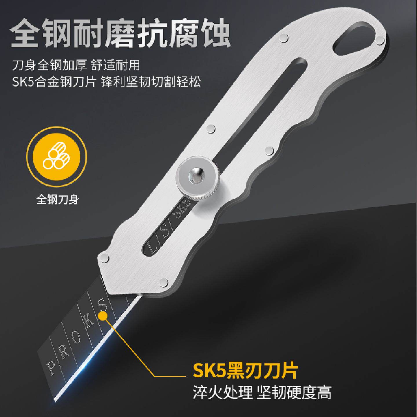 这款全不锈钢美工刀采用重型全钢加厚设计,具备出色的耐用性与抗腐蚀性,适用于工业级高强度作业。刀身整体由优质不锈钢一体成型,结构坚固,握感舒适,防滑手柄确保操作安全精准。配备可替换多功能刀片,锋利持久,轻松应对壁纸、墙纸、塑料、皮革及电工材料等多种切割任务。推拉式锁刀结构便于调节刀头长度,使用更灵活。无论是装修、手工制作还是电工维修,这款多功能美工刀都能高效胜任,是专业工匠和DIY爱好者的理想工具,兼具实用性与长久使用寿命。