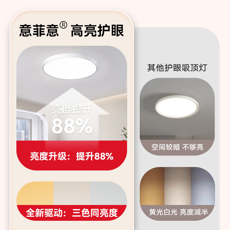 意菲意「日光」护眼卧室吸顶灯,采用高品质LED光源,模拟自然日光光谱,光线柔和均匀,有效减少蓝光危害,呵护家人视力健康。简约现代设计,适配主卧、书房、儿童房等多种空间,营造舒适温馨氛围。高显色指数(Ra≥95),真实还原物体色彩,提升视觉体验。配备智能调光调色功能,满足不同场景需求。安装便捷,节能环保,使用寿命长达30000小时。套餐组合灵活,可搭配同系列灯具打造整体照明方案,是追求健康照明与美学设计家庭的理想之选。