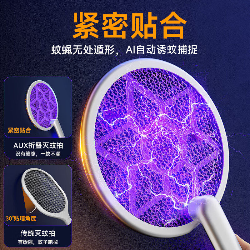 奥克斯2026新款电蚊拍集灭蚊、照明于一体,采用充电式设计,续航持久,使用更便捷。搭载超强力三层电网,瞬间高压击打,灭蚊高效静音,安全不漏电。创新可折叠设计,收纳轻松,节省空间,适合家庭、宿舍等多种场景。内置LED诱蚊灯,夜间自动吸引蚊虫,提升灭蚊效率。手柄符合人体工学,握感舒适,防滑耐用。配备Type-C快充接口,充电快速,环保节能。无论是拍打还是静置诱捕,都能轻松应对蚊蝇困扰,是夏季家居必备的智能驱蚊利器,守护全家健康睡眠。