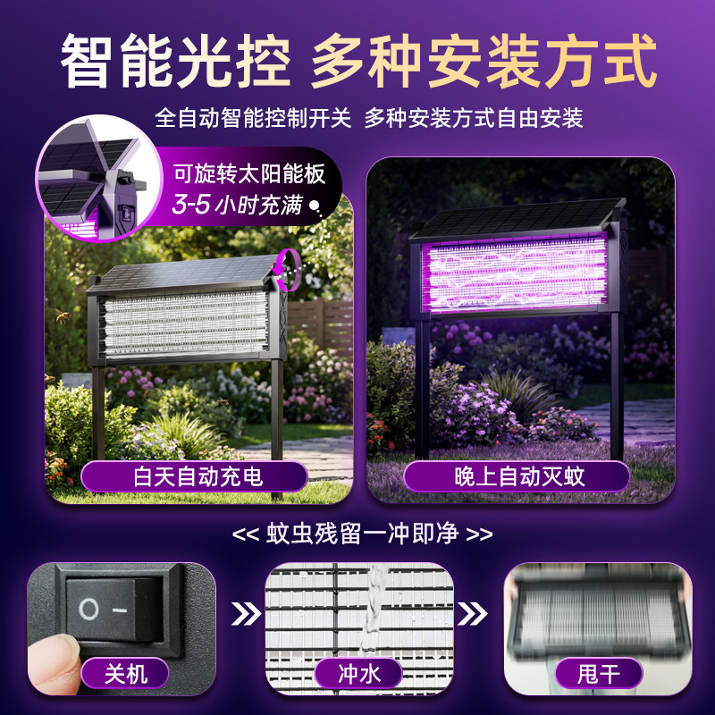 2026新款太阳能灭蚊灯,专为果园、庭院、花园等户外场景设计,集高效灭蚊与环保节能于一体。采用先进光触媒技术,模拟人体气息吸引蚊蝇,配合UV紫光灯与高压电网,实现物理灭杀,安全无毒,守护家人健康。全机身防水防锈,适应各种天气;内置高容量锂电池,白天太阳能自动充电,夜晚持续工作8-10小时,无需布线,安装便捷。静音运行,不扰民,是家庭户外、果园防虫的理想选择。节能环保,长效耐用,让夏夜更安心、更宁静。