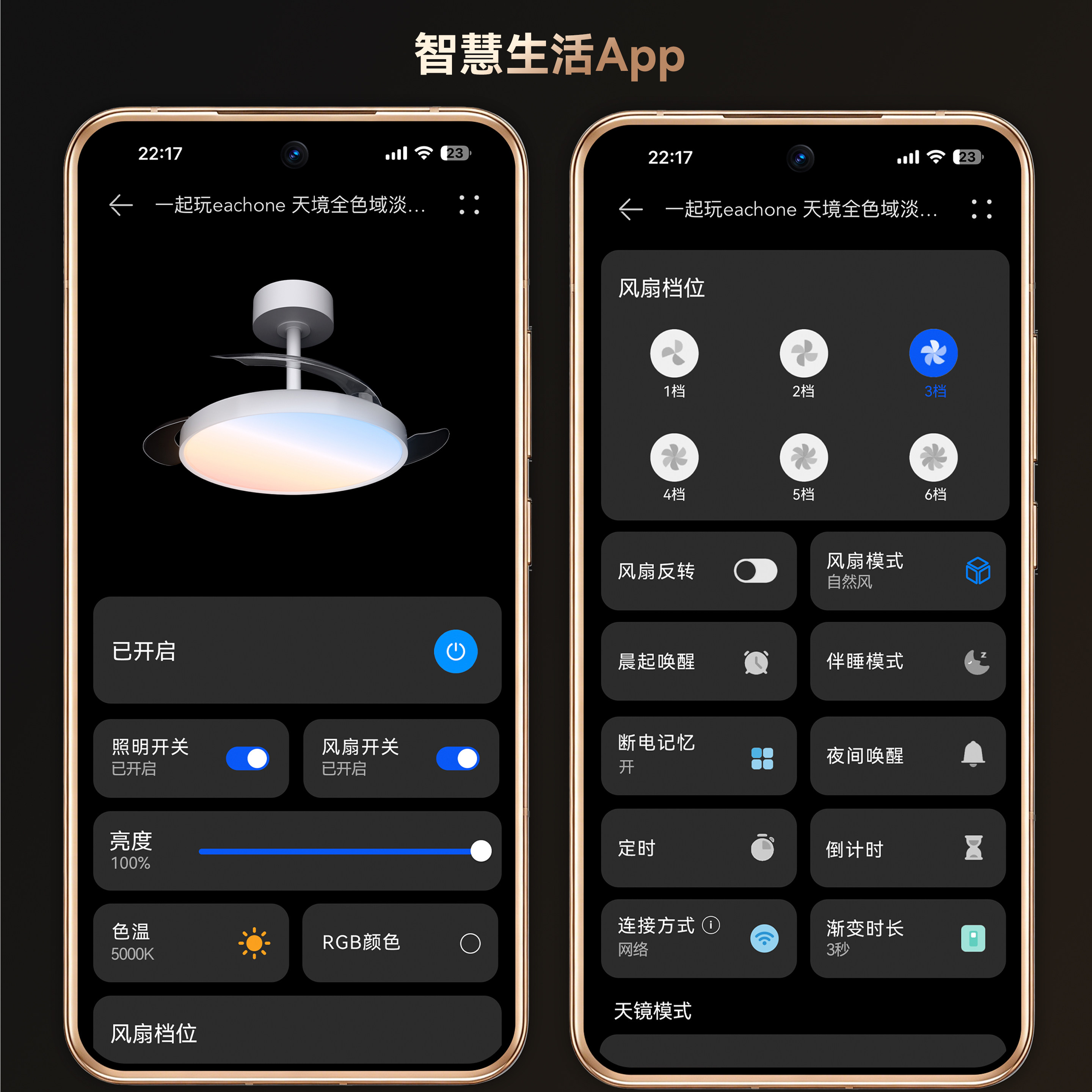 天境隐形风扇灯是一款集照明与送风于一体的智能家用吊扇灯,适用于餐厅、卧室等多种场景。采用淡彩护眼灯光设计,光线柔和均匀,有效缓解视觉疲劳,营造舒适氛围。扇叶隐形收纳,不使用时自动收起,节省空间且美观大方。支持鸿蒙智联,可通过手机APP或语音助手远程调控风速、灯光亮色温,操作便捷。静音电机运行平稳,节能低耗,兼顾实用与美观。无论是夏日纳凉还是日常照明,天境隐形风扇灯都能为您的家居生活增添智能与优雅。