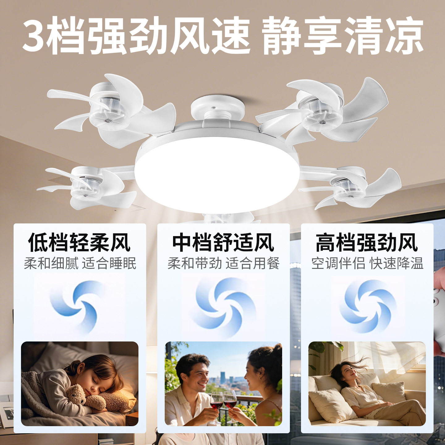 2026新款E27螺口吊扇灯集照明与送风于一体,专为客厅、卧室、餐厅等空间打造。采用标准E27螺口设计,适配多种LED灯泡,安装便捷,节能环保。扇叶采用静音空气动力学设计,三档风速可调,运行平稳低噪,营造舒适体感。灯体精选优质金属与亚克力材质,现代简约风格,适配多种家居装修。遥控操作,支持照明与风扇独立控制,四季可用——夏季送凉,冬季反转促进空气循环。一体式设计节省空间,兼具实用性与美观性,是提升居家舒适度的理想选择。