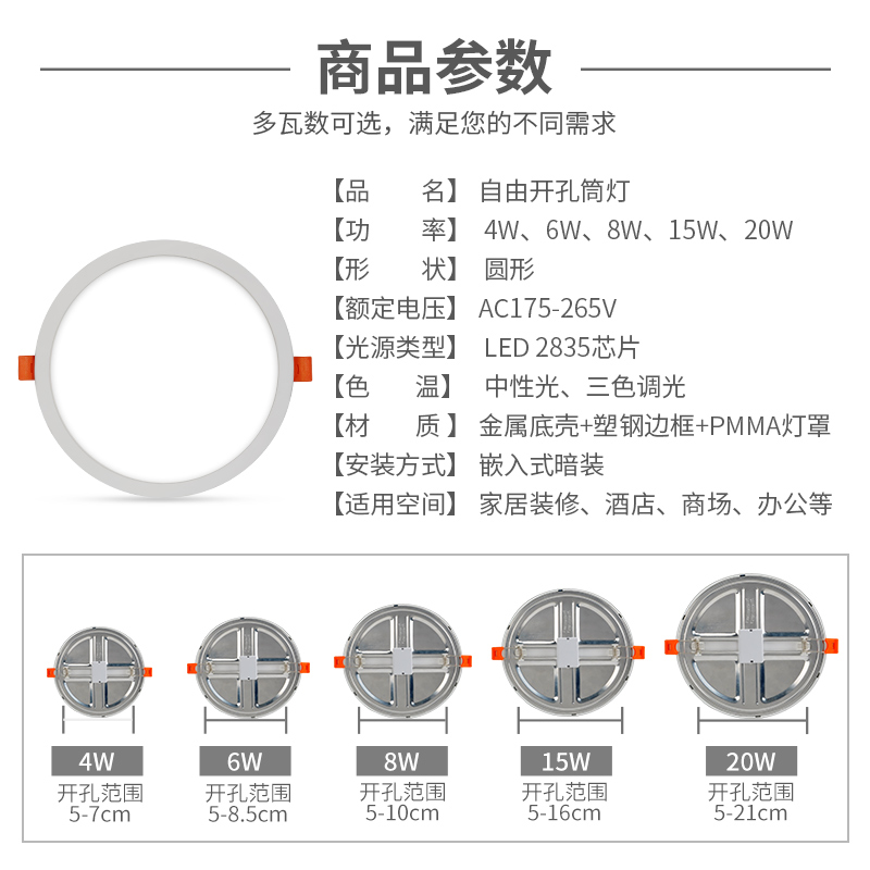 LED超薄筒灯是一款专为现代家居与商业空间设计的嵌入式天花灯,适用于走廊、过道、玄关等区域。采用自由开孔设计,安装灵活,适配多种吊顶结构,无需固定开孔尺寸,轻松实现无缝嵌入。灯体超薄轻便,节省空间,美观大方。支持三色变光功能(暖光、自然光、白光),一键切换,满足不同场景氛围需求。高显色指数搭配防眩光设计,光线柔和均匀,保护视力。节能环保,寿命长,是洞灯、射灯的理想选择,广泛应用于住宅、酒店、办公等场所,兼具实用性与装饰性。