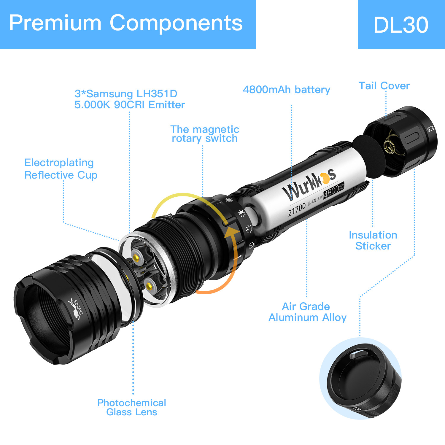 淘宝索菲恩DL30潜水手电筒3500lm磁控开关三颗LH351D高显色21700便携