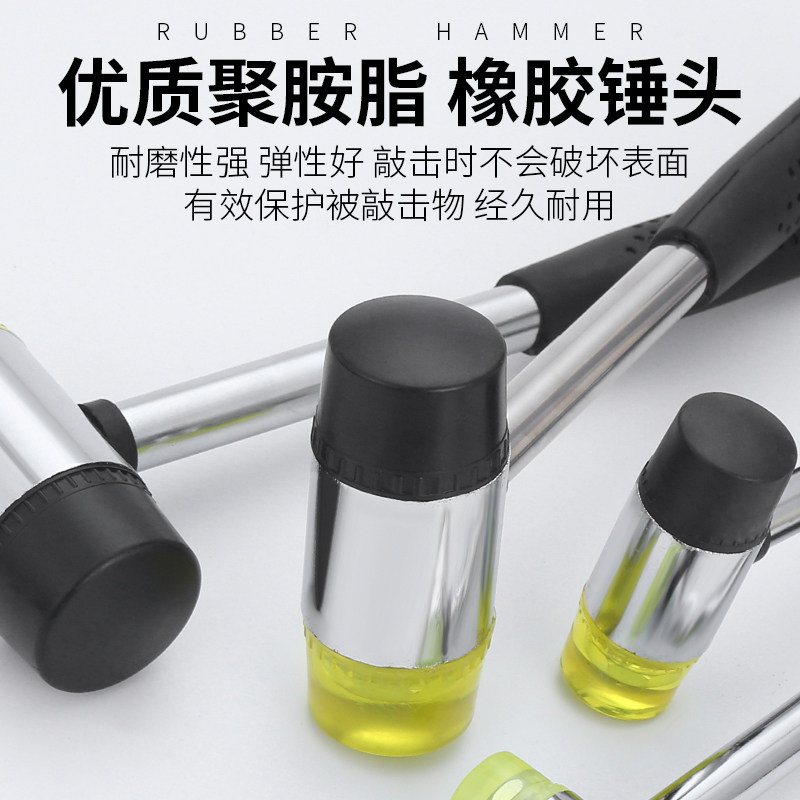 橡胶锤、实心锤、小锤子、橡皮锤、实心胶皮安装锤、拓印敲打锤及橡胶榔头,是一类广泛应用于装修、木工、家具安装及工艺品制作等领域的非金属敲击工具。其锤头采用高弹性橡胶或环保胶皮制成,质地坚韧且富有缓冲性,可有效避免对被加工表面造成划伤或凹陷。适用于瓷砖铺贴、地板安装、模具调整、拓印工艺等精细作业。实心结构增强耐用性,手柄多为人工学设计,握感舒适、减震防滑。相比金属锤,橡胶锤敲击力柔和、噪音低,兼具安全性与精准性,是现代手工与装修中不可或缺的多功能工具,广受工匠与DIY爱好者青睐。