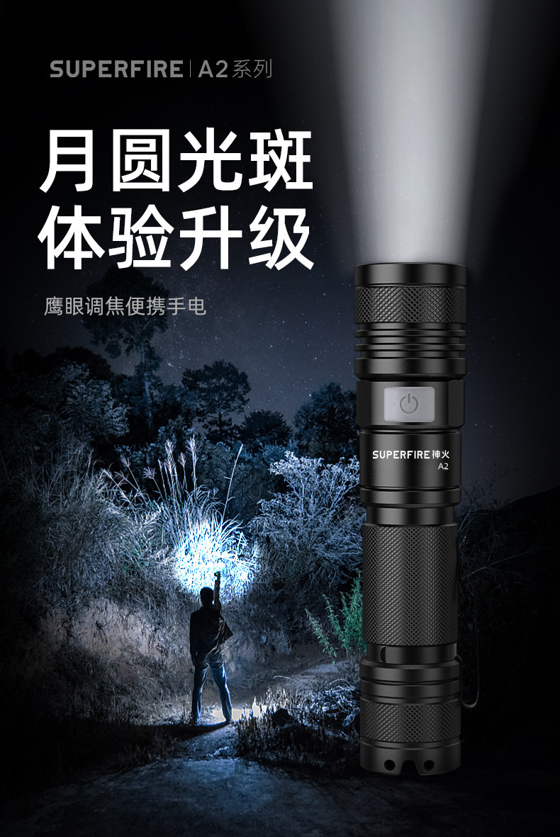 天猫神火官方旗舰A2强光迷你小手电筒便携耐用led充电调焦户外远射灯