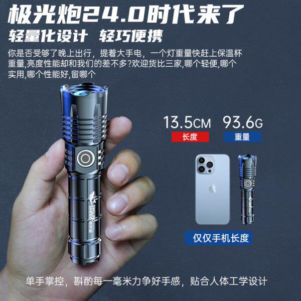 2024新款迷你超亮强光手电筒,集便携、高亮、远射于一体,专为户外爱好者设计。采用高功率LED灯珠,最大亮度可达2000流明,照射距离超300米,支持多档调光与一键爆闪功能,应对夜间徒步、露营、搜救等场景游刃有余。创新变焦设计,可自由调节聚光与泛光模式,满足不同使用需求。内置大容量可充电锂电池,Type-C快充,续航持久。机身采用航空铝合金材质,防水防摔,仅重约80克,小巧轻便,可挂钥匙或放口袋。无论是日常应急还是专业户外,这款手电筒都是您可靠的随身光源。