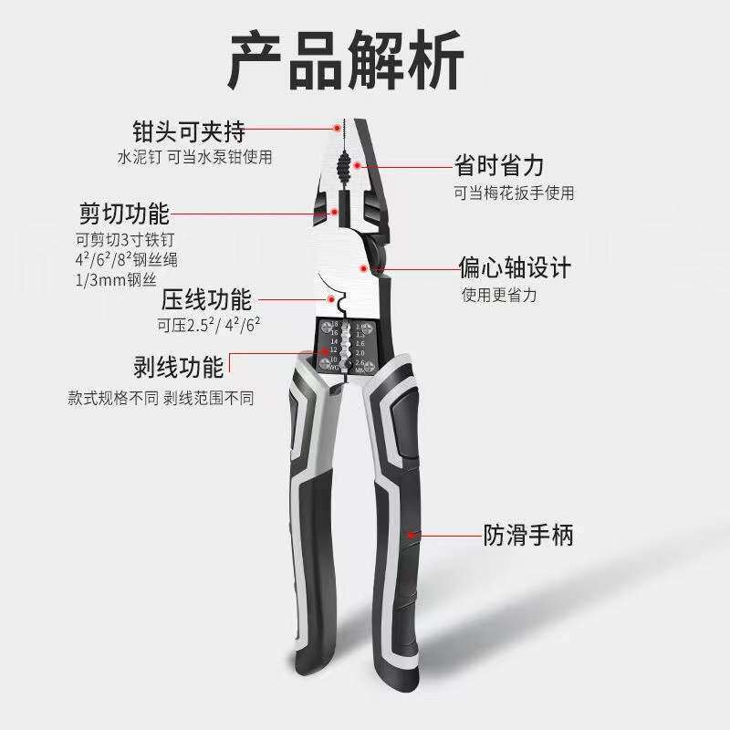德国多功能9寸钢丝钳,集省力设计、工业级品质于一体,堪称家用与专业维修的理想之选。采用高碳合金钢锻造,硬度高、耐磨损,搭配精密热处理工艺,确保长久耐用。人体工学防滑手柄,握感舒适,省力结构轻松剪切钢丝、铝线及软金属。多功能设计融合尖嘴钳、斜口钳与老虎钳功能,适用于电子维修、家居安装、DIY创作等场景。今日特价,性价比超高,德国工艺匠心打造,品质值得信赖。无论是日常应急还是专业作业,这款钳子都能高效应对,是工具箱中不可或缺的得力助手。限时优惠,抢购从速!