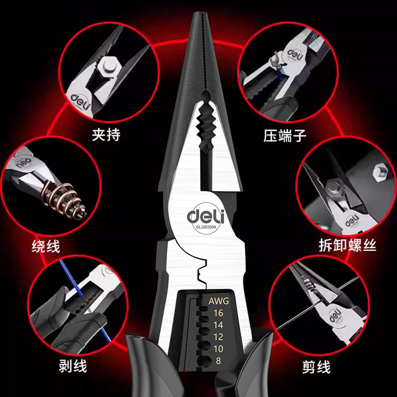 得力尖嘴钳是一款专为电工及工业用途设计的多功能精密工具,采用优质高碳钢锻造,硬度高、耐磨性强,表面经防锈处理,持久耐用。其细长尖嘴设计,可精准夹持、弯曲或剪切细小零件,适用于狭窄空间操作,广泛用于电子维修、家电安装、手工制作等领域。钳口咬合紧密,手柄符合人体工学,握感舒适,防滑省力。兼具剪切、夹持、弯折等多种功能,既是专业电工的得力助手,也适合家庭日常使用。迷你便携,家用收纳方便,是工具箱中不可或缺的实用工具。得力品牌保障,品质可靠,性价比出众。