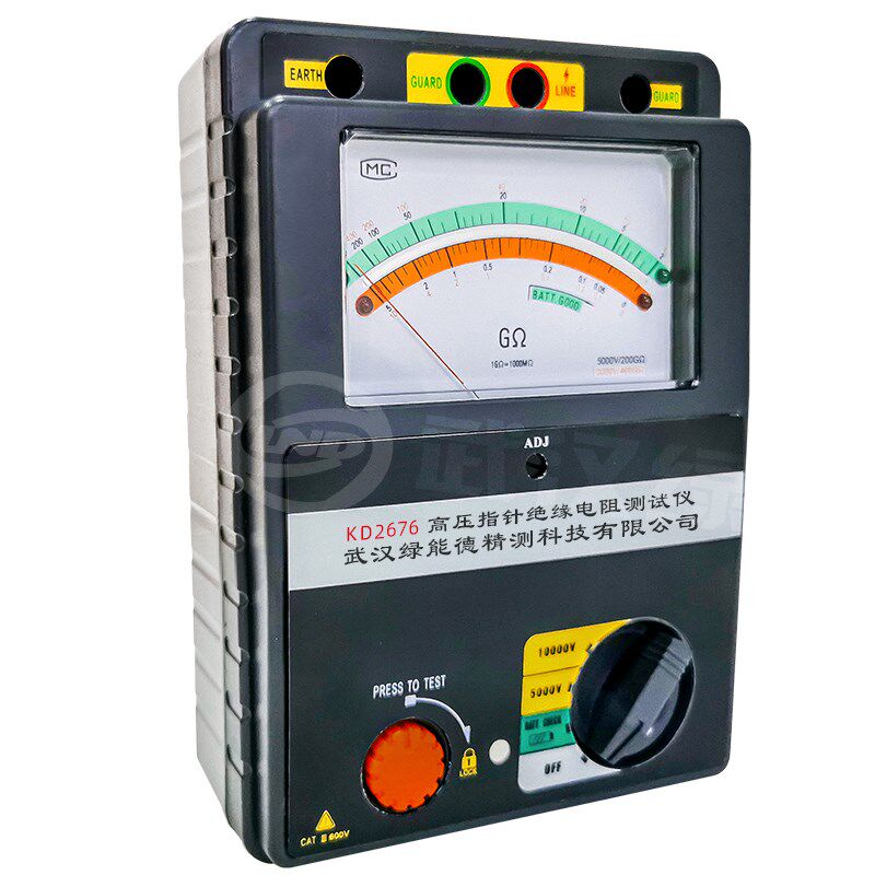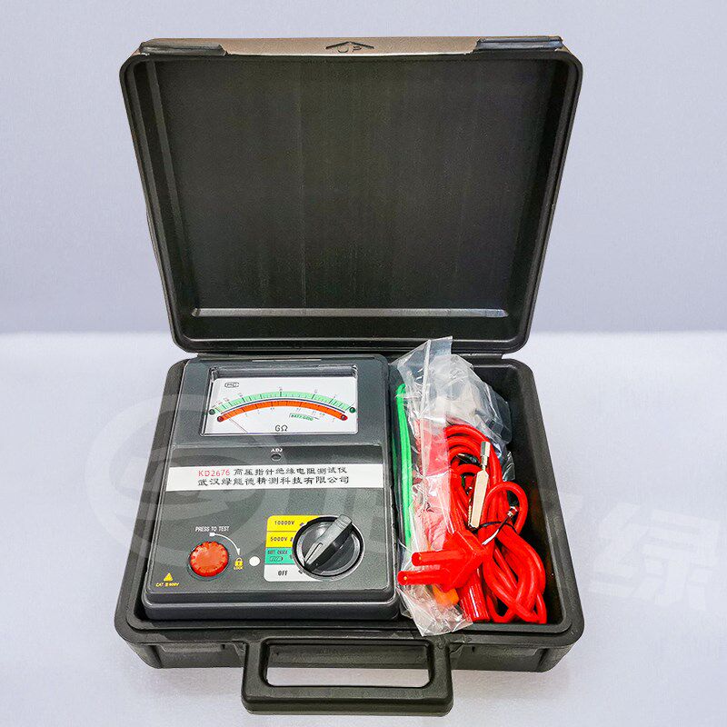 KD2676手持指针式绝缘电阻测试仪是一款便携式高压兆欧表,支持10000V和5000V双档位输出,适用于电力设备、电缆、电机及大型电气装置的绝缘性能检测。采用指针式显示,读数直观稳定,抗干扰能力强,特别适合现场快速判断绝缘状况。内置高压发生器,输出稳定可靠,具备短路保护功能,确保操作安全。整机结构坚固,携带方便,广泛应用于电力、铁路、石化等行业。其高精度测量与耐用设计,使其成为维护人员检测高压设备绝缘电阻的理想工具,有效预防电气故障,保障系统安全运行。