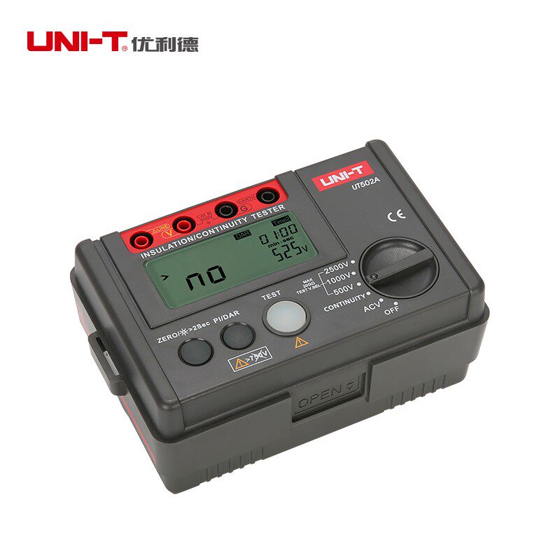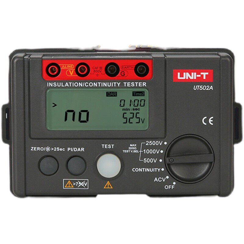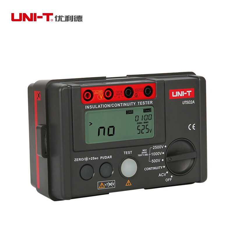 优利德UT501A/UT502A数字绝缘电阻测试仪(兆欧表/摇表)是一款便携式高精度绝缘检测设备,适用于电力、通信、家电维修及工业设备维护等领域。该系列产品采用数字显示技术,具备自动量程切换功能,测量范围广,分辨率高,可快速准确测量绝缘电阻值。UT501A和UT502A支持多档测试电压(如250V、500V、1000V等),满足不同场景需求。具备数据保持、低电量提示及自动放电功能,保障操作安全。机身轻便耐用,符合IP防护等级,适合户外及恶劣环境使用。凭借稳定可靠的性能与人性化设计,成为电工及技术人员进行电气设备绝缘性能检测的理想工具。
