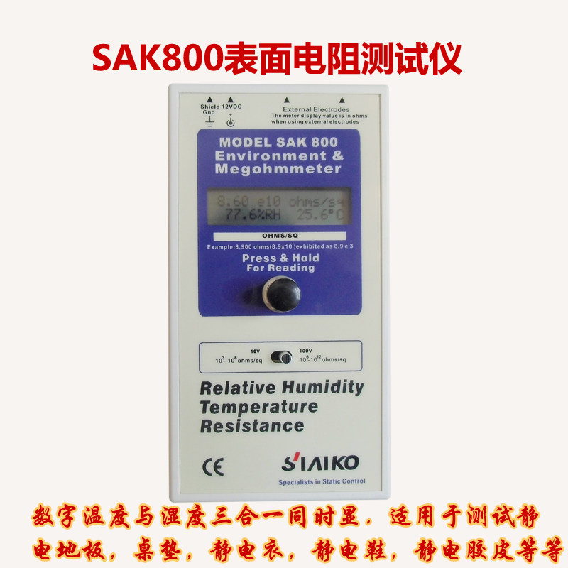 SAK800重锤表面电阻测试仪(RT-1000数显兆欧表/ACL-800静电电阻抗计)是一款专业用于测量材料表面电阻、体积电阻及静电耗散性能的精密仪器。采用重锤式电极设计,符合IEC、EOS/ESD等国际标准,确保测量结果准确可靠。配备高清数字显示屏,支持宽量程测量(通常10³~10¹²Ω),适用于防静电地板、工作台面、包装材料等材料的ESD性能检测。操作简便,响应迅速,具备自动量程切换和电池低电量提示功能。广泛应用于电子制造、半导体、航空航天及科研领域,是静电防护体系质量控制的重要工具,有效保障产品安全与生产环境可靠性。