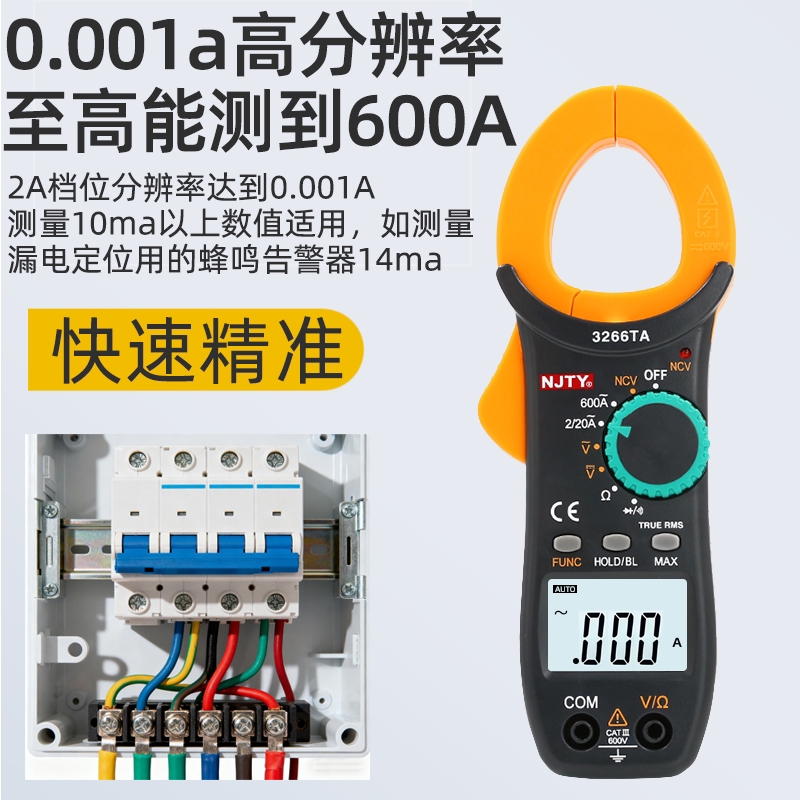 这款高精度数字钳形万用表专为电工设计,具备0.001mA(即1μA)的微小漏电电流检测能力,可精准识别线路中的微弱漏电故障,提升用电安全。采用防烧设计,有效保护仪表在误操作或过载情况下的安全。体积小巧、便携易用,集钳形电流测量与万用表功能于一体,支持交流/直流电流、电压、电阻、通断测试等多种功能。LCD背光显示屏清晰读数,适合家庭、工业及电气设备维护场景。其高灵敏度和稳定性,使其成为排查隐蔽漏电、保障电路安全的理想工具,尤其适用于精密电气检测与节能诊断。