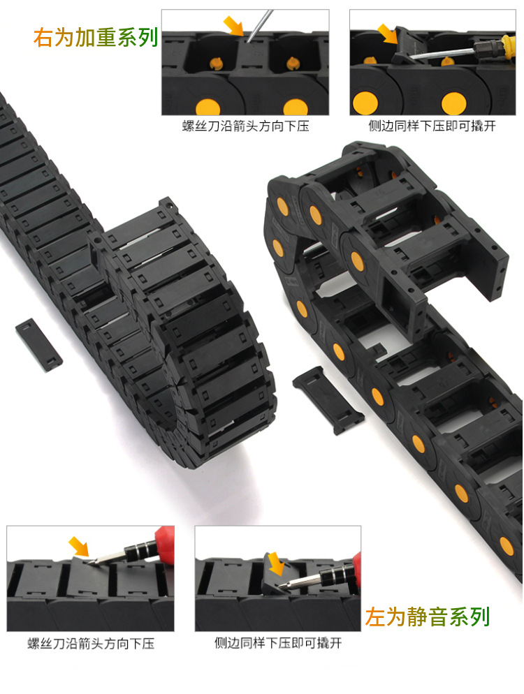 *:拖链安装工序 拖链的安装的工具很简单一个平头螺丝刀即可。拖链表面都有开启空,用准备好的平头螺丝刀垂直插入盖板两端的开启孔中,稍微用力即可打开盖扳,将电缆、油管等按照合理的的放置原则,放入电缆拖链内部,然后盖上盖板,很简单的就操作完成了。下面就是固定了,每种都备有安装孔,装配很便捷,值得注意的是电线的固定端和活动端均应去张力装置加以固定,以达到更好的保护。
