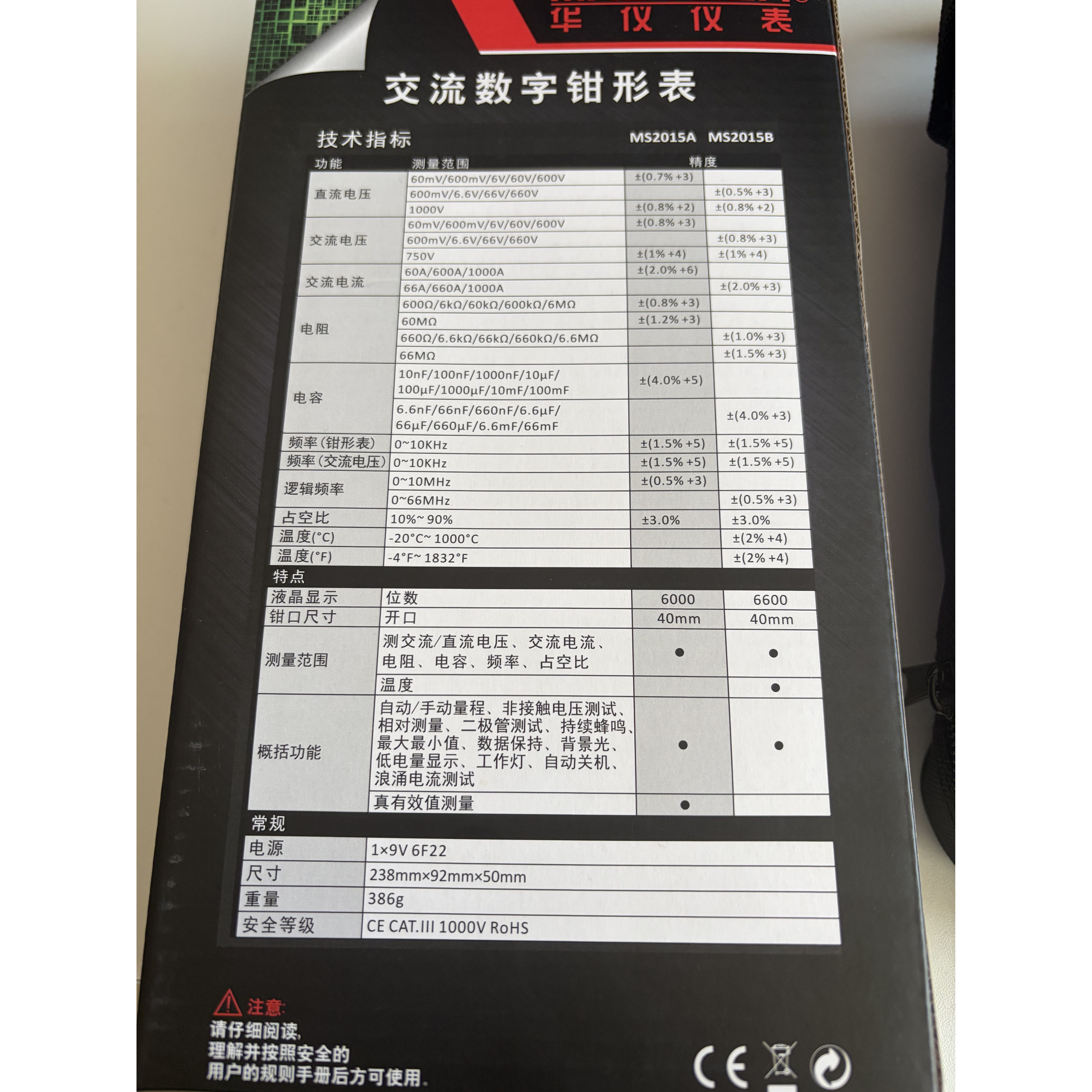 华仪MS2015B数字钳形表是一款高精度、多功能的电工测量仪表,专为交流电流测量设计,最大可测1000A大电流,无需断开电路即可快速检测,操作安全便捷。除交流电流外,还可测量直流/交流电压、电阻、电容、频率、通断及二极管等参数,真正实现一表多用。配备高清背光LCD显示屏,数据读取清晰直观,支持数据保持功能,提升测量效率。钳头设计紧凑,适合在狭小空间使用,具备过载保护和低电量提示,确保使用安全。广泛应用于电力、工业、 HVAC 及电气设备维护等领域,是专业电工和工程技术人员的理想工具。