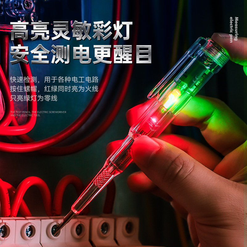 这款电笔是电工专用多功能智能感应检测工具,集验电、试电、断线检测与螺丝刀功能于一体。采用高亮彩光LED显示,红绿双色清晰指示带电状态,夜间作业更安全可靠。具备非接触式智能感应技术,可精准探测交流电场,无需直接接触导体即可判断线路通断,大幅提升操作效率与安全性。内置高灵敏度传感器,响应迅速,误报率低。笔身符合人体工学设计,防滑耐用,尾部集成一字/十字两用螺丝刀头,一物多用。适用于家庭电路检修、工业设备维护等多种场景,是专业电工和DIY爱好者的理想助手。