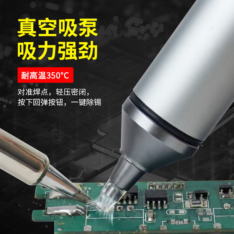 铝合金强力吸锡器是一款专为电子维修设计的便携式手动真空吸锡泵,采用高强度铝合金材质,轻便耐用且散热性能优异。其核心功能是通过手动按压产生负压,快速清除焊点上的多余焊锡,适用于电路板元件拆焊、维修及DIY电子制作。配备耐高温吸嘴,兼容多种烙铁头尺寸,操作简便高效。相比传统吸锡线,吸锡更彻底、效率更高,有效避免焊盘损伤。广泛应用于手机、电脑、家电等精密电子设备的维修场景,是电子工程师和爱好者的理想工具。结构紧凑、无需电源,携带方便,安全可靠。