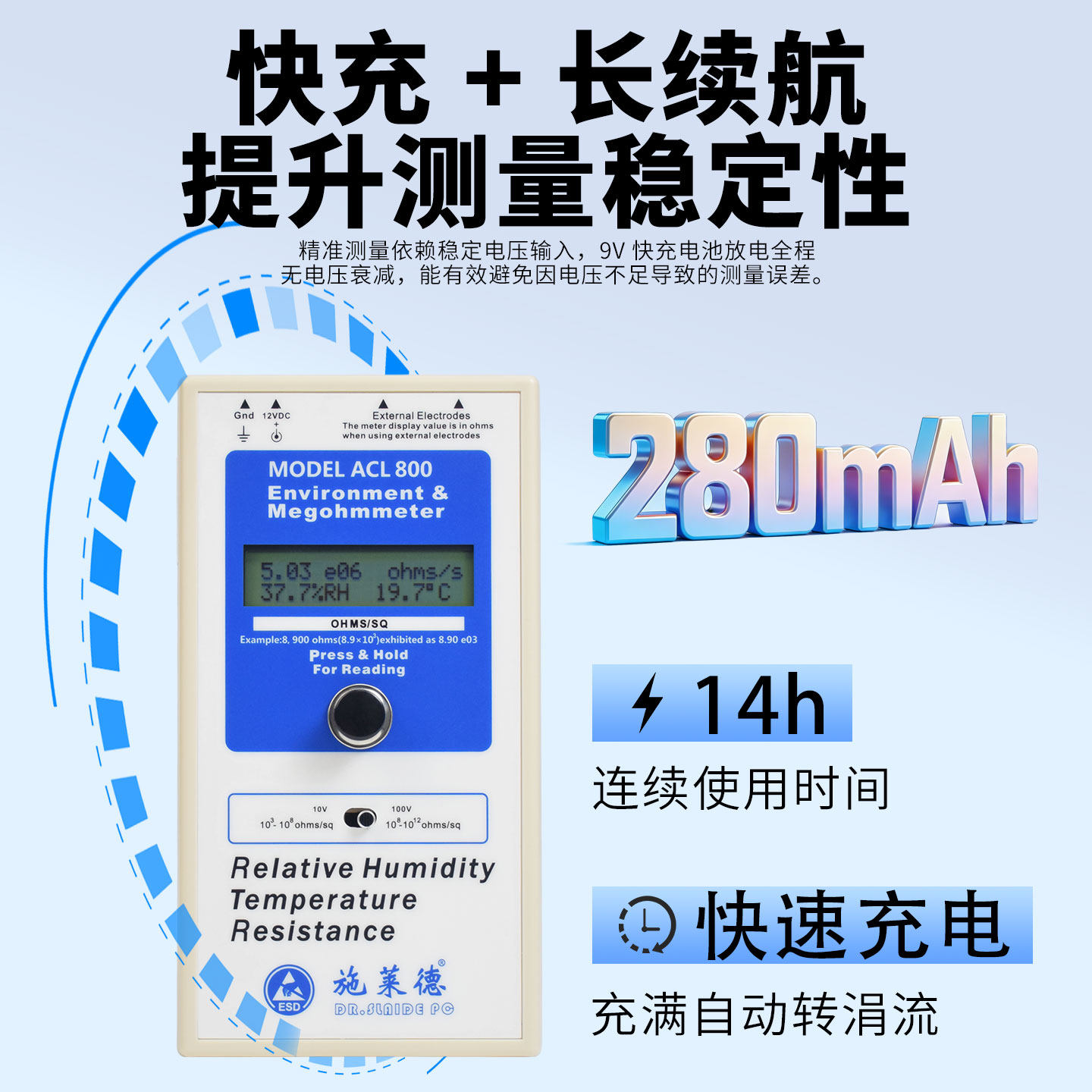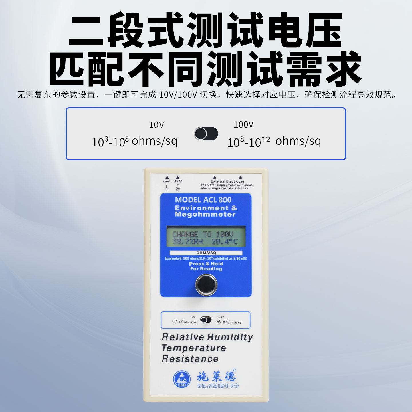 ACL800表面电阻测试仪是一款高精度、数显式防静电检测专用仪器,采用符合国际标准的重锤式电极设计,可精准测量材料表面电阻、体积电阻及阻抗值,量程覆盖10³至10¹²Ω,适用于防静电地板、工作台面、包装材料等关键区域的电阻性能检测。仪器具备自动量程切换、数据保持和实时显示功能,操作简便,结果直观。其高灵敏度和稳定性满足IEC、EOS/ESD等标准要求,广泛应用于电子制造、半导体、医疗设备及航空航天等对静电控制要求严格的行业,是保障生产环境静电安全的重要工具。