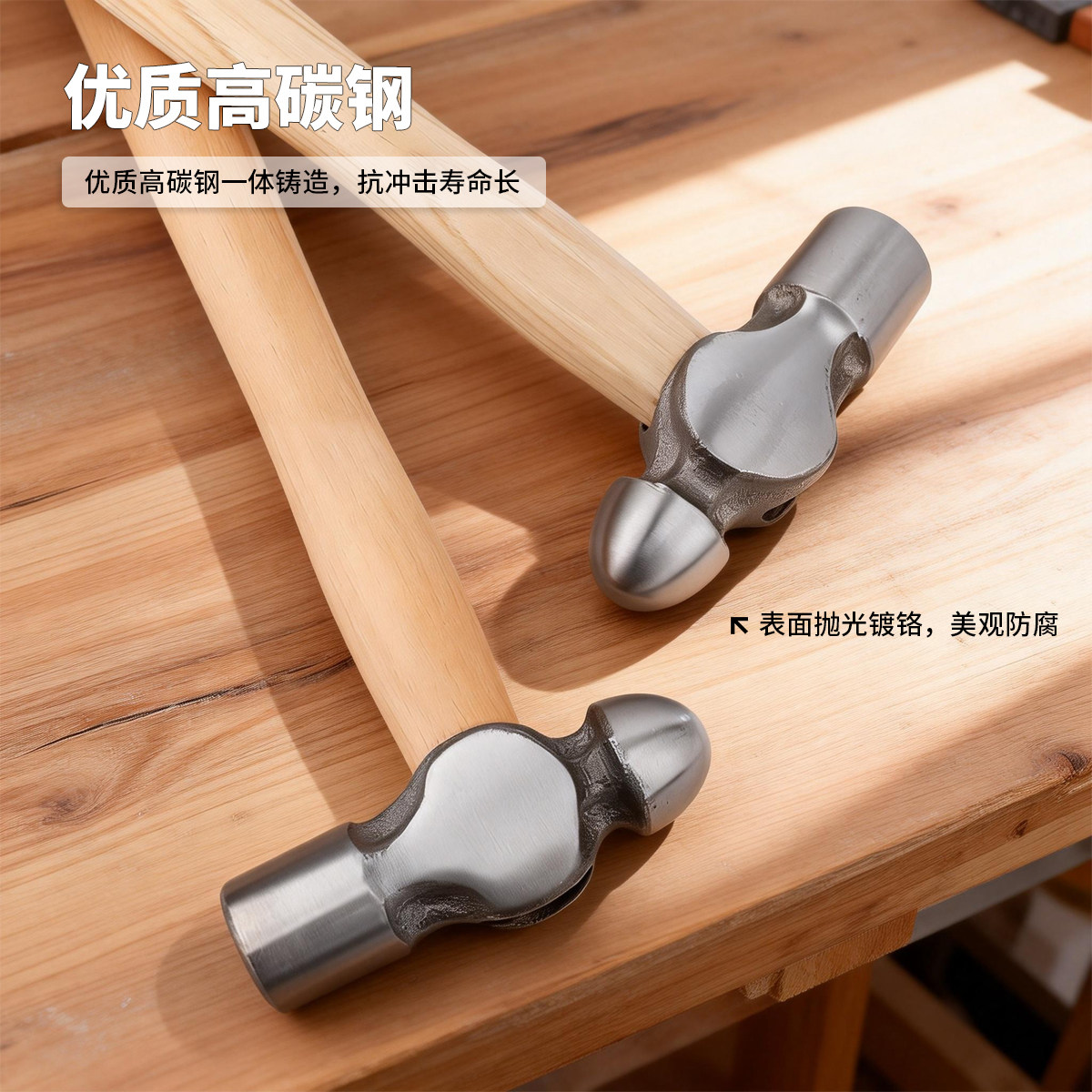 圆头锤,又称奶头锤或小榔头,是一种常见的家用五金工具,广泛应用于木工、装修及日常维修。其锤头一端为平面,用于敲击钉子或物件;另一端呈圆弧形,俗称“奶头”,常用于金属加工中的整形、铆接或调整工件位置。锤头采用优质高碳钢锻造,硬度高、耐磨损,手柄多为天然硬木制成,握感舒适、减震防滑,使用安全省力。整体结构坚固耐用,适合家庭DIY、木工安装及轻型作业。因其多功能性和实用性,圆头锤成为工具箱中不可或缺的基础工具,是家庭和工匠的得力助手。