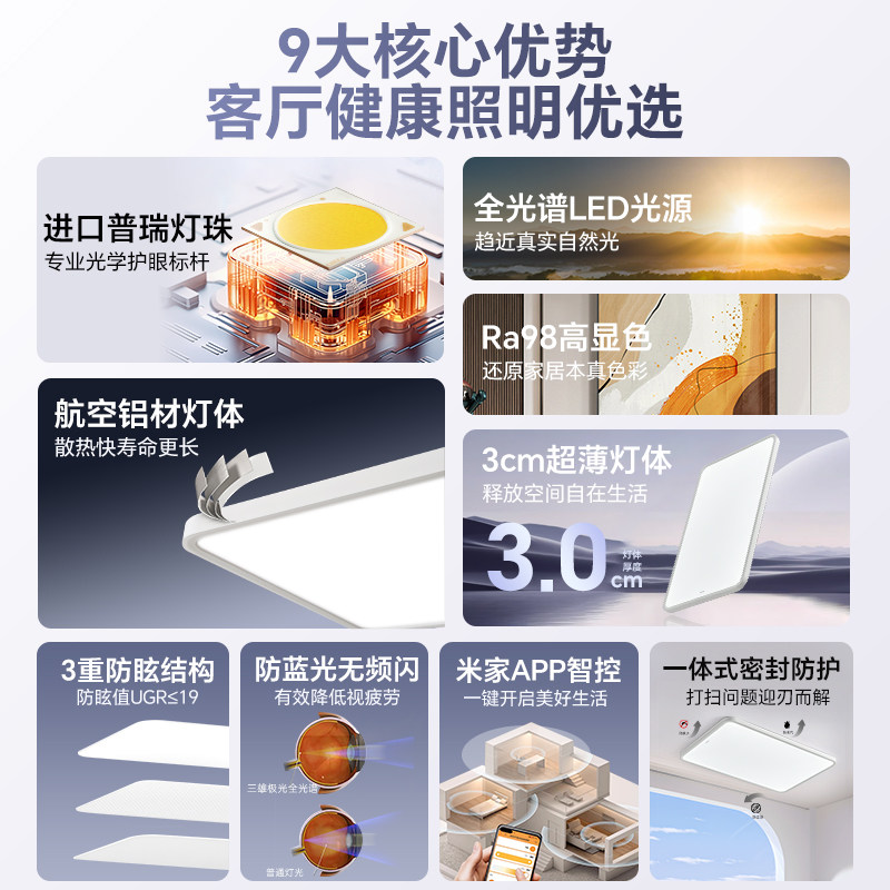 三雄极光全光谱护眼客厅吸顶灯卧室超薄智能全屋套餐灯具,专为直播与居家照明优化设计。采用全光谱LED技术,高度还原自然光,有效缓解视觉疲劳,保护双眼健康。超薄机身融合现代简约风格,适配多种家装场景。支持智能调光调色,可通过手机APP或语音控制,随心切换温馨、专注、直播等模式,满足不同时段用光需求。高显色指数(Ra≥95)真实还原色彩,尤其适合直播、化妆、阅读等精细用眼场景。全屋套餐涵盖客厅、卧室等多空间照明方案,安装便捷,节能环保,是追求健康光环境与智能生活品质的理想之选。