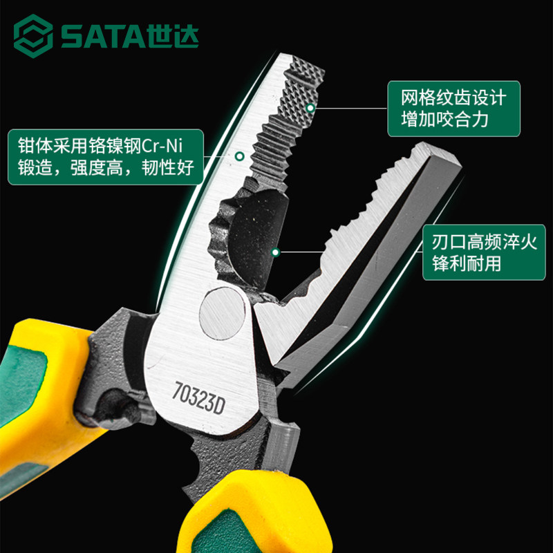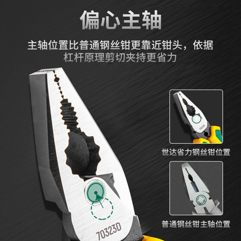 世达工业级钢丝钳系列涵盖6、7、8英寸多种规格,包括老虎钳、尖嘴钳、斜嘴钳等专业工具,专为电工及工业作业设计。采用优质高碳钢锻造,经热处理工艺强化,硬度高、耐磨性强,确保长久耐用。钳口精密加工,咬合紧密,剪切力强劲,可轻松处理钢丝、电线及金属材料。人体工学防滑手柄设计,握感舒适,操作省力,有效降低疲劳。符合国际安全标准,绝缘性能优异,适用于带电作业环境。世达钳子以卓越品质与可靠性能,成为电工、维修及制造业专业人士的首选工具,兼顾高效作业与安全需求。