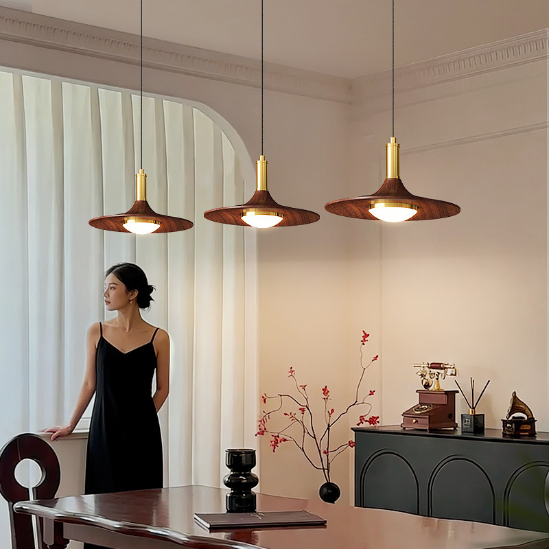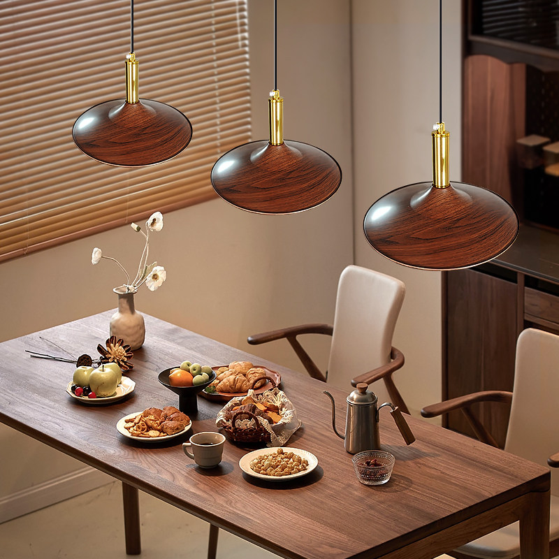天猫箭牌中古风餐厅吊灯复古飞碟灯胡桃木色护眼吧台饭厅餐桌三头灯具