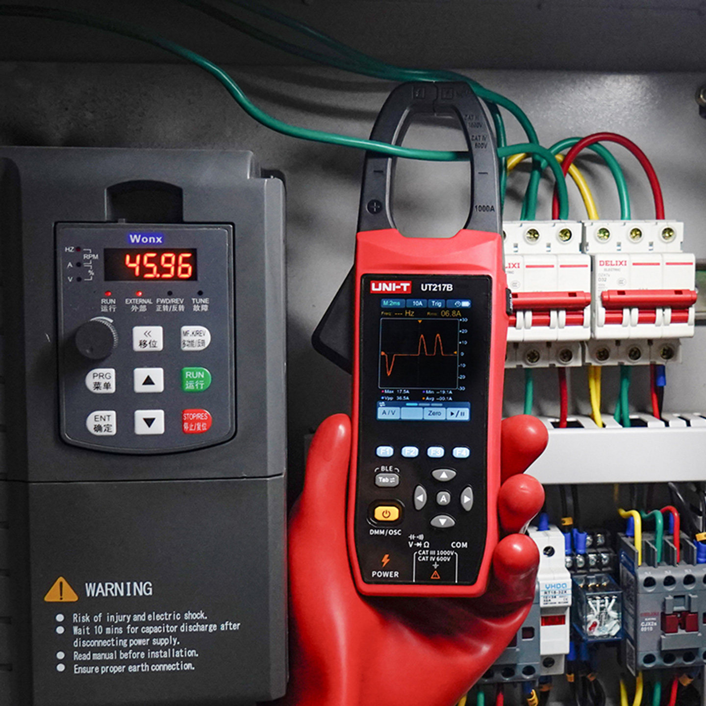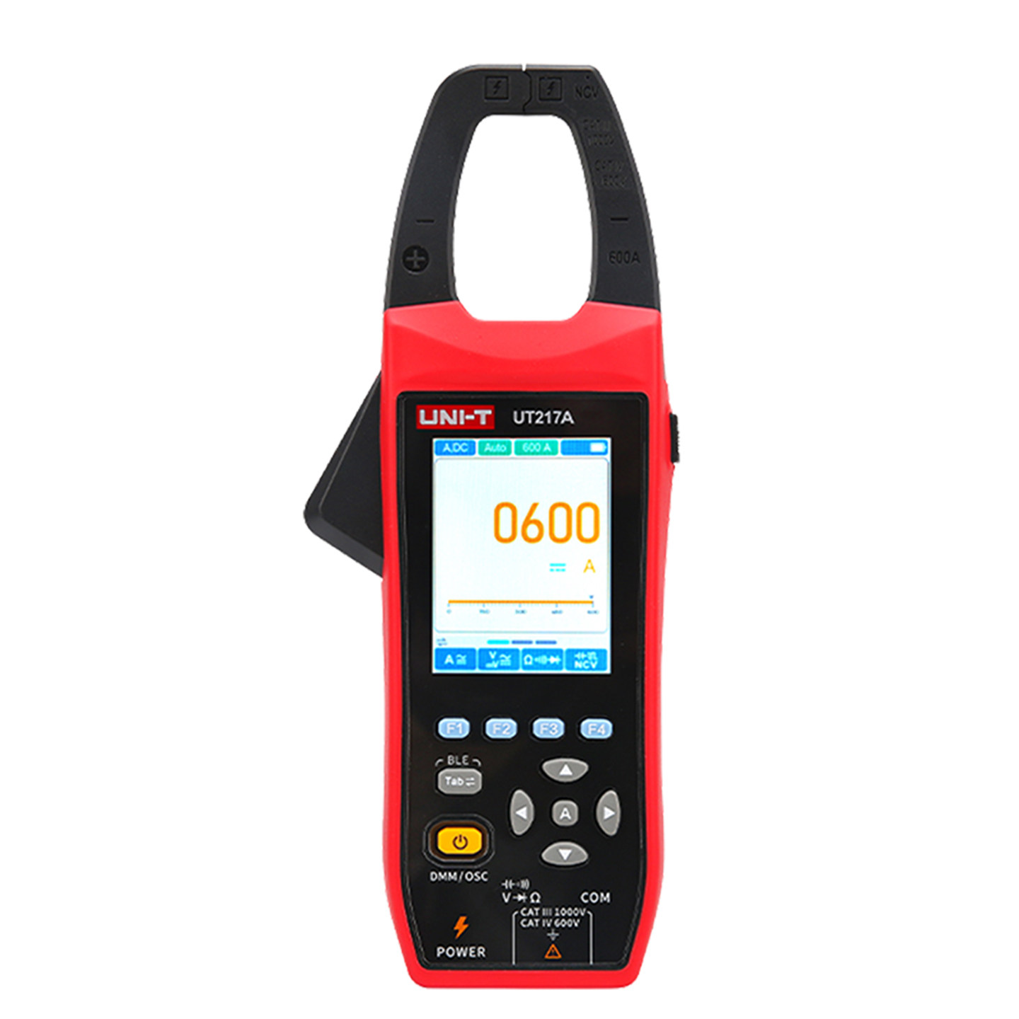 优利德UT217A/B是一款集数字万用表与示波器功能于一体的二合一钳形表,专为电工、工程师及维护人员设计。它支持交直流电流测量,量程高达1000A,并采用真有效值(True RMS)技术,确保在复杂波形下仍能精准读数。配备大尺寸LCD显示屏,支持波形实时显示,便于分析电流波动与异常。钳头开口宽大,测量便捷,同时具备数据保持、自动关机等实用功能。UT217A/B结构坚固,符合CAT III安全标准,适用于工业配电、电机检测等高压环境,是现场电气检测的高效可靠工具。